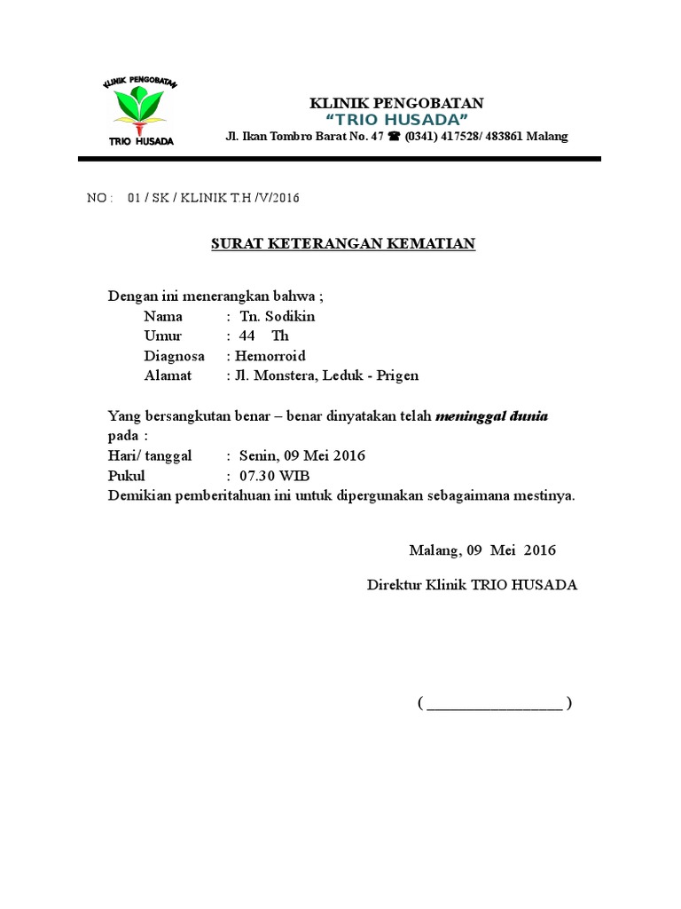 Biasanya di gunakan sebagai pengganti tanda tangan judul: Untuk format lainnya, silakan sesuaikan dengan perusahaan yang bersangkutan. Surat keterangan kematian adalah sebuah surat yang dikeluarkan oleh kelurahan atau desa untuk menerangkan bahwa seseorang telah meninggal dunia. Contoh surat pernyataan ahli waris jual beli tanah. Contoh surat keterangan kematian rumah sakit.